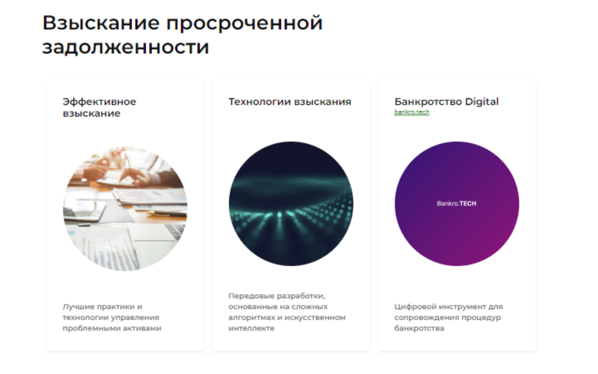 В перечне услуг: досудебное и судебное взыскание, исполнительное производство, выкуп долгов. Возврат просроченной задолженности происходит на основе агентского соглашения.